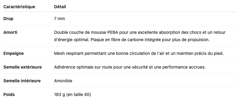 - Amorti réactif : Mousse PEBA + plaque carbone = confort et dynamisme, avec un drop de 7 mm parfait pour la propulsion.